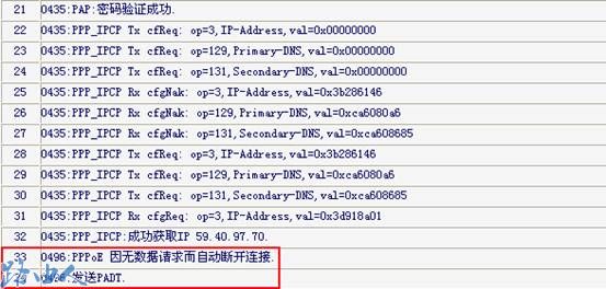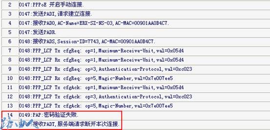 当你设置了PPPOE拨号后,无法获取WAN口IP时,可进入管理界面―系统工具―系统日志,如果你看到的日志是: