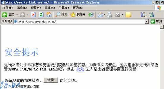 设置了WPA-PSK/WPA2-PSK AES加密不会弹出此页面,若出现的话可能是浏览器缓存的问题,建议清除缓存后,重启浏览器即可。