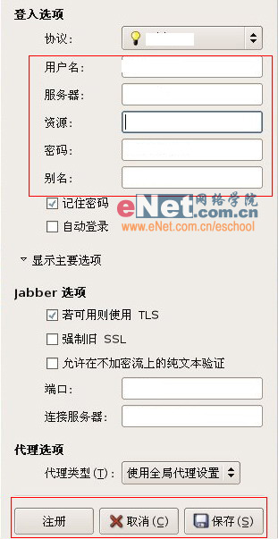 Gaim默认便已支持ICQ。如果也想使用MSN或别的即时通讯软件,则需要加载相关的模块。在登陆选择框中填入“用户名”、“服务器名”、“协议”、“资源”、“密码”等相关信息后点击“注册保存”即可。