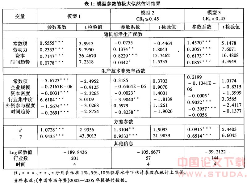 为了验证不同市场竞争程度与外商直接投资技术外溢效应的关系。本文采用Frontier 4.1的计量软件,首先以我国2000—2003年201个四位码制造业行业的面板数据为样本估计方程中的所有参数;其次,计算出2000—2003年四年中201个行业的平均行业集中度,以CR8=0.45为标准将全部样本分为 CR8<0.45(144个行业)和CR8≥0.45(57个行业)两组,检验不同市场竞争程度下,外商直接投资技术外溢效应的变化趋势,估计结果如表1所示。