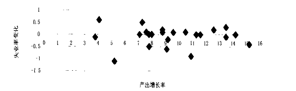 根据奥肯定律:Ut 一Ut-1 =-β(gyt—gyn ) 式中Ut,Ut-1分别表示当期和前期的失业率;gn为潜在的产出增长率(美国大约为2.5%~3%);是当期产出的实际增长率;(表示超过正常增长的增长如何转化为失业率的下降)。即实际产出高于自然产出,失业率下降;实际产出低于自然产出,失业率上升。根据常云昆、肖六亿(2004)和浦艳萍(2005)对失业率与产出增长的趋势线作出的回归性分析,结果分别是有98.12%[3]和99.94%[4]的失业率的变异无法用产出增长来解释,由t检验可知Ut 一Ut-1与gyt之间相关度很低,显然不符合奥肯定律。