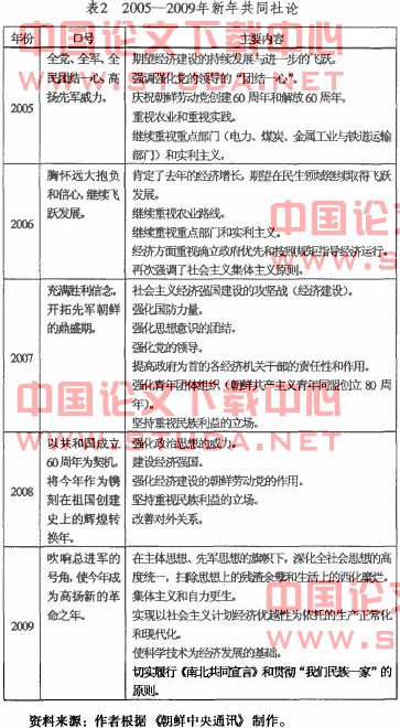 由于朝鲜经济改革的各种措施及出现的社会变化,使朝鲜从2006年开始从重视现实利益的“实利主义”向强调社会主义计划经济原则、集体主义原则的经济政策转换。例如,2006年作为国营企业评价基准的“利润指标”变为“纯收入”指标。根据朝鲜多名经济学家的解释,其理由是企业为调动工人劳动积极性,出现过度提高生活费(工资)倾向所致。纯收人=销售收入一成本(成本为:补偿费+原材料费+生活费)表2将2005-2009年的新年共同社论的主要内容进行了归纳。可以看出,以2006年为分水岭,由