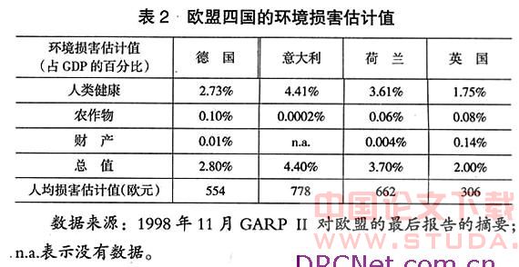 表2中的数据说明,四个国家的环境污染都对人类健康的损害值较大,在三种污染物中,影响最大的是大气中可吸入颗粒物(PM10)。德国、意大利、荷兰、英国四国的环境污染损害估计值分别占本国GDP的2.80%、4.40%、3.70%、 2.00%。而1990年GARPI的相应估计值为意大利4.1%,荷兰5%,英国3.3%。当然,GARP I和GARPII的数据不具有可比性,因为两个项目采用的方程和计量方法是有差异的。总体上说,GARP I的估计值普遍高于GARPII的对应估计值(除意大利外)。