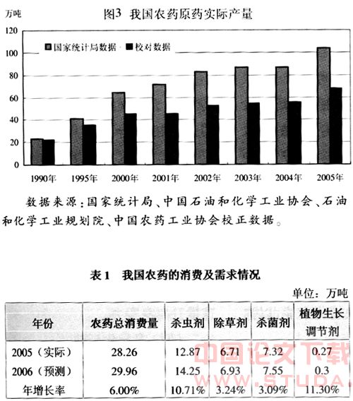 由上个世纪90年代中,农药行业开始极度繁荣后的萎缩,直自2003年世界农药市场才实现在产品结构变化上的实际增长,而后逐渐步入一个销售市场的稳定期,近几年销售额稳定在310亿美元左右。根据图1的历史数据曲线判断,农药行业的增长正处于上升期,行业的高速增长仍可维持一段时间。我国农药行业在“十一五”的产业方针指导下,在十七大胜利召开后的国家战略转变下,农民收入必将迎来建国后的第三个增长期。农业劳动力向工业的转移,蔬菜水果等经济作物种植面积持续增长,生产资料的加大投入,都将大力带动农药消费的增长。结合世界产业背景,国外权威咨询机构预测,未来几年我国农药消费将以7%的速度增长,国际国内需求的稳定增长无疑给我国农药行业发展提供了充足的动力。