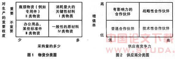 供应商合作伙伴关系的建立体现了企业内外资源集成与优化利用的思想,这种环境下,企业产品的制造过程的周期会因供应商的密切配合而缩短,而且对顾客服务的响应速度和服务质量也将提高。那么,什么样的情况下适于构建供应商伙伴关系呢?现实的复杂情况表明这种伙伴关系根据制造商和供应商之间合作程度的不同存在不同的层次,图1和图2从不同的角度提供了指导性策略。图1从实务的角度出发,将制造业的物资按采购量和对生产的重要程度两个维度将物资分为四类,并认为应对Ⅰ类和Ⅳ类物资分别与供应商建立关键性和一般性的伙伴关系。图2中则按照供应商在所在行业的竞争力和供应商相对于企业的增值能力这两个维度将供应商分为四种:普通合作伙伴、技术合作伙伴、影响力合作伙伴和战略合作伙伴。