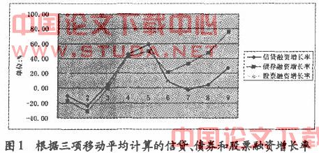 根据表2,在三项移动平均法下,由总额来看,贷款融资与债券融资是先降后升的趋势,而股票是先升后降再升的趋势。由于三者融资额的数据相差太大,做成图表表达不够理想,故以在三项移动平均法下的数据为基础,计算各自的年增长率,做成表3,再以表3为基础,做成图1,以此来判断融资的发展趋势。