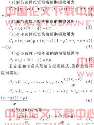 根据投资组合模型的思想,企业与职员在人力资本的投资,实际上是培训投资过程中的博弈,可以用如图1的博弈树来描述。假设企业承担培训投资成本的比率为,选择投资策略的概率为q;职员选择投资策略的概率为P。通过培训投资,企业因人力资本增加而经营效率提高所得到的利益为,职员因人力资本增加而职业生涯改善或薪酬、福利增加所获得的利益为r。为增加人力资本而进行培训投资的成本为c。按照组合投资模式的思想,企业承担的成:本为CX;职员承担的成本为c (1一)。显然,r一c>>r一c>0,1>P、q、>0。