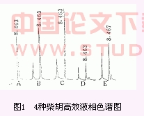 2.4 样品含量测定 精密称取4种柴胡粉末各0.5g。用甲醇25ml 40℃温浸20min后,按上述条件进行样品制备和含量测定,结果见图1、表1。