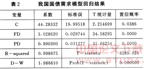 从回归系数上看,我国国债规模(C)与财政赤字(FD)、信贷规模(L)、居民储蓄(S)和国债还本付息(PD)都呈正相关关系。其中,财政赤字和国债还本付息的系数最大,是影响我国国债规模的决定性因素,说明我国的国债需求很大程度上是为了弥补财政赤字和偿付国债本息,而不是以宏观经济政策为导向的市场主动选择的结果。