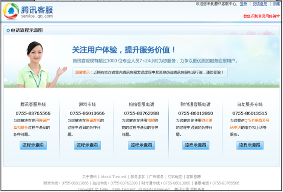 目前有部分用户不知道腾讯公司的客服电话,腾讯官方的建议是:登录腾讯客服网站获得正确的客服电话。