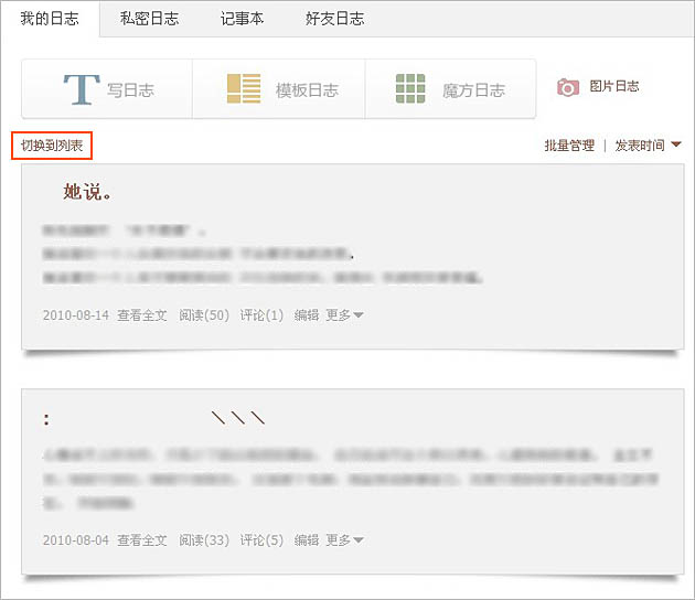 在QQ空间日志列表中,目前分为列表模式和摘要模式。